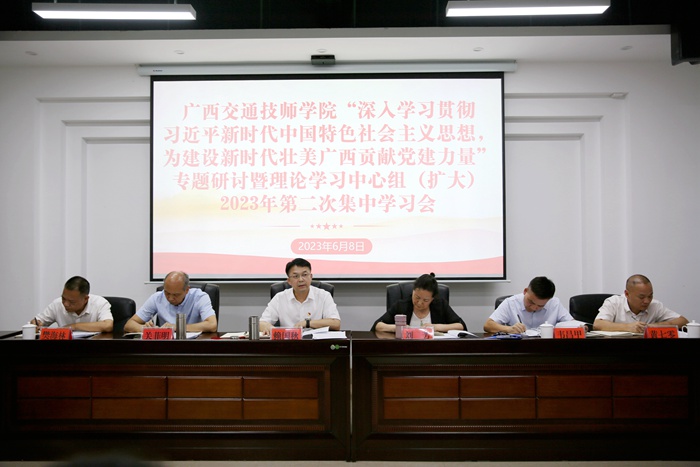 6月8日,广西交通技师学院召开“深入学习贯彻习近平新时代中国特色社会主义思想,为建设新时代壮美广西贡献党建力量”专题研讨暨理论学习中心组(扩大)2023年第二次集中学习会,深入学习习近平总书记重要讲话精神,围绕研讨专题及推动学院高质量发展开展的调查研究进行交流。