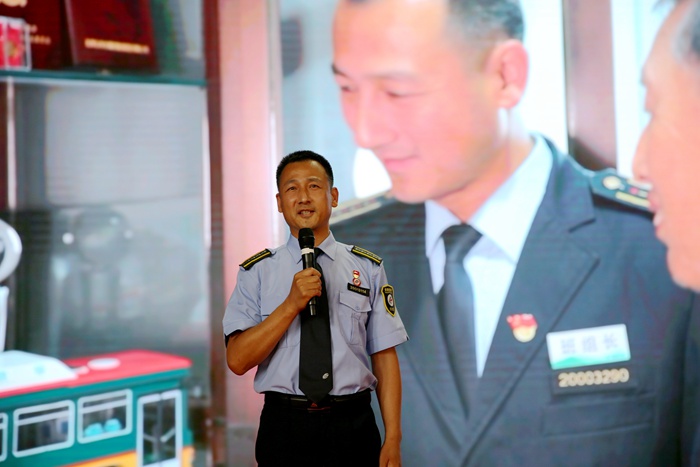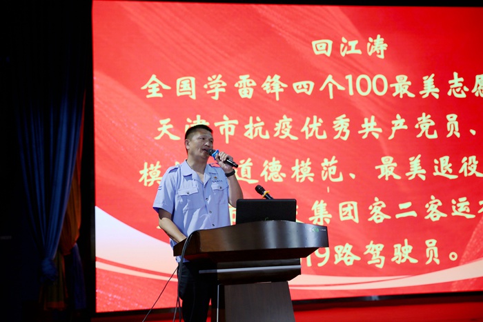 全国学雷锋四个100最美志愿者、天津市抗疫优秀共产党员、劳动模范、道德模范、最美退役军人回江涛讲述了用心打造“天津公交头等舱”的动人故事。他在宣讲中说道:“这23年中我始终坚持的一件事是不断探索车厢人性化服务的深加工,让乘客在十米车厢里坐享幸福。”
