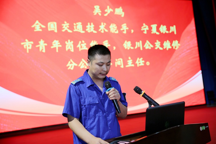 全国交通技术能手、宁夏银川市青年岗位能手、银川公交维修分公司车间主任吴少鹏围绕对维修工作的热爱,分享了从学徒工,到维修技术骨干,再到车间主任的成长故事,激励青年们用劳动追梦新时代,用奋斗建功新征程。