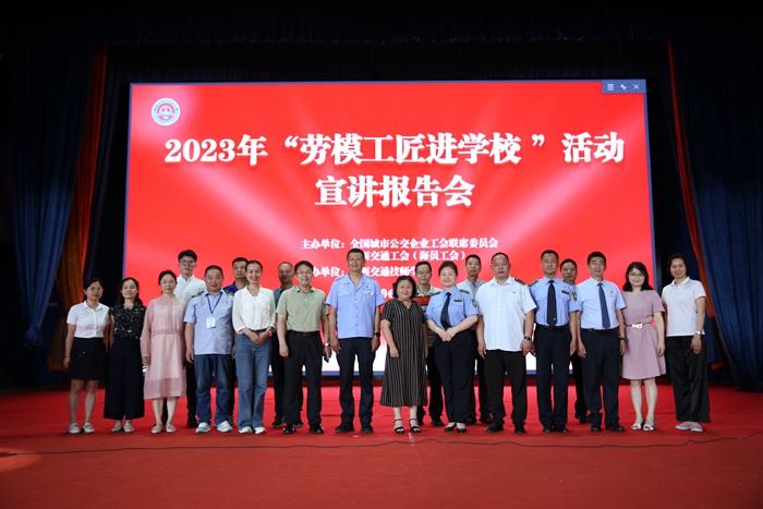 6月1日下午,全国城市公交系统的8位劳模工匠走进广西交通技师学院,分享成长经历。广西交通工会(海员工会)主席廖红梅,广西交通技师学院党委书记赖国秋、副院长黄七零、全国城市公交系统的劳模工匠代表,自治区交通运输厅直属二层单位、广西北部湾投资集团有限公司、广西北部湾国际港务集团有限公司、广西交通投资集团有限公司的有关领导以及广西交通技师学院的师生代表们在学院礼堂共同聆听了劳模故事。