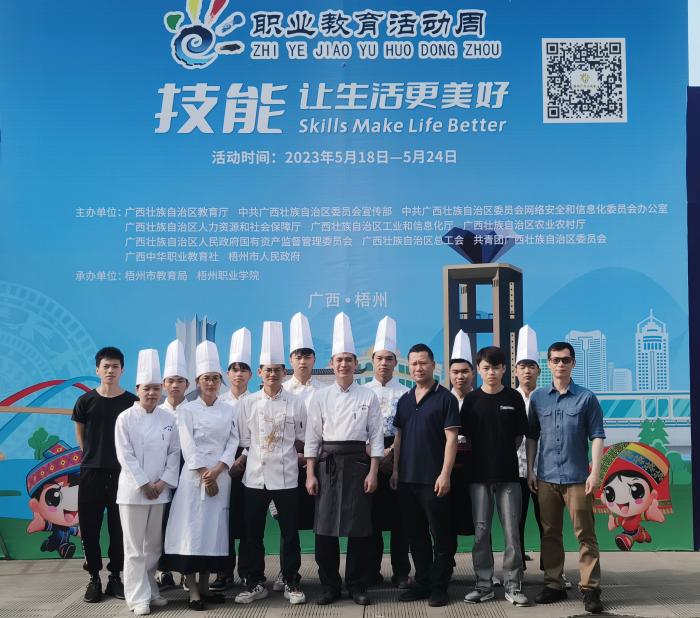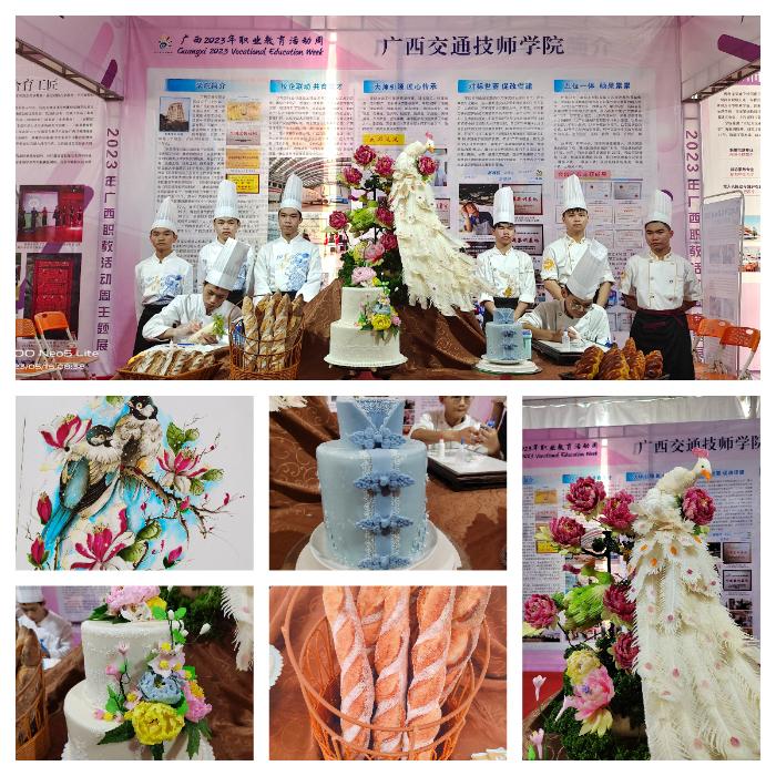 学院派出梁仕栋、罗惠光、欧志龙、韦怡仙、邵琼等五位老师和部分烹饪专业学生到梧州职业学院广西2023年职业教育活动周启动仪式现场,在主题展区广西交通技师学院展位进行交流与展示。本次活动中商务服务系的参展项目有:果蔬雕刻、果酱画装饰、面点欧包、蛋糕裱花、现场雕刻等。