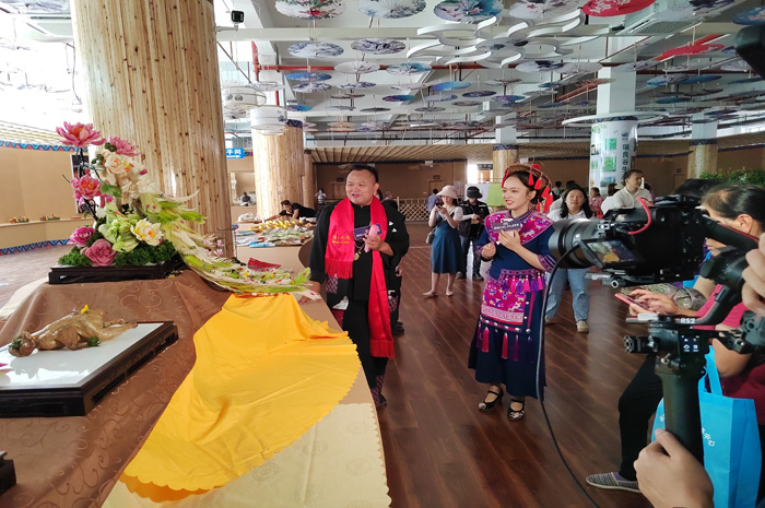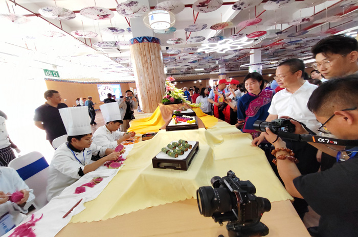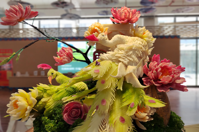 本次活动中学院的参展作品有孔雀喜迎宾、壮乡假娄夹、邕味白切鸭、壮乡五色饭、艾香糯青团等共9个,其中具有壮乡风情的主雕刻作品——孔雀迎宾,是利用心里美萝卜、青萝卜、胡萝卜等普通食材,运用阴阳纹雕、镂刻、整雕等技法,由师生共同设计,共同雕刻、组装完成,寓意孔雀喜迎宾、花开自富贵。因其色彩艳丽、造型大气、设计精美,展示出精湛的刀工技艺和美好寓意,受到活动观众的热烈追捧,纷纷与之合影留念。同时师生展示的现场雕刻技艺、民族特色菜肴等,也同样获得现场观众热情围观点赞。活动期间,环江县领导亲临展位参观指导,环江县融媒体也进行了报道推送。
