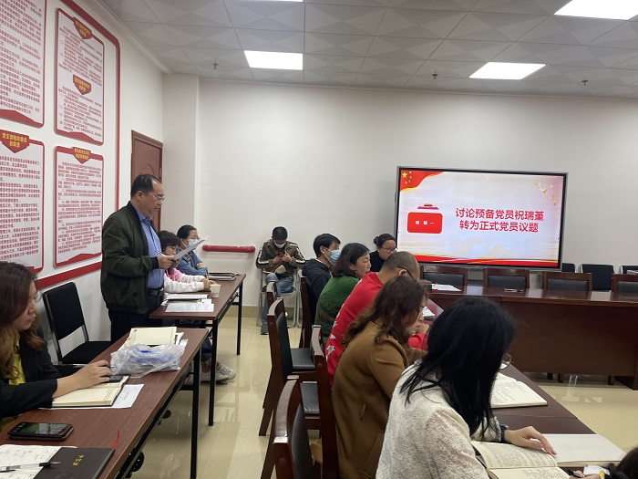 会议按照党员发展程序进行,预备党员祝瑞堇同志在会上宣读《转正申请书》,认真汇报自己在预备期间思想、工作和生活的情况及今后努力的方向。随后,2名入党介绍人就预备党员的预备期表现及能否转正提出建议。与会党员就祝瑞堇同志能否按期转正进行了充分讨论,通过无记名投票方式表决,一致同意祝瑞堇同志转为中共正式党员。