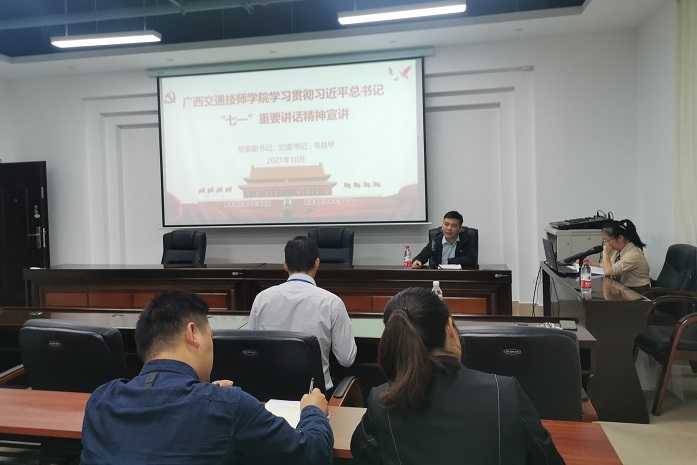 课上,韦书记深刻阐述了习近平总书记“七一”重要讲话的重大意义、主要内容和丰富内涵,多角度深入解读党的伟大历程、党的精神谱系和党的历史使命。结合学习贯彻习近平总书记“七一”重要讲话精神,探讨如何在党的百年奋斗史中汲取营养经验和精神力量,以党建引领学院中心工作发展,推进“一体化教学改革”,加快交通运输特色品牌专业建设,更好地提升学院管理能力和水平,更好更快推动学院高质量发展。