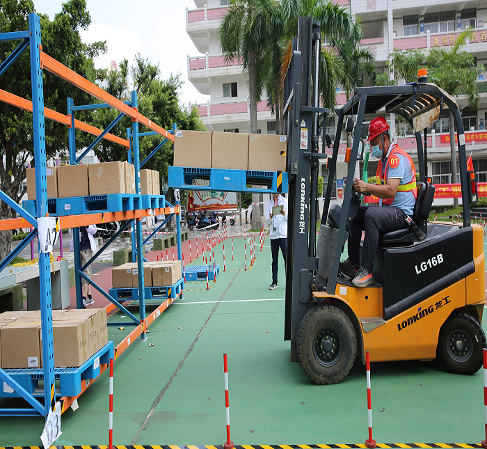 据悉,本次大赛共有56名选手参加了,分为理论知识和实际操作两大部分。其中实际操作环节分为“带货绕桩”“货品入库”、“过约束区”、“托盘堆垛”等科目。主要考验参赛选手的操作规范、速度、精准度和临场应变能力。