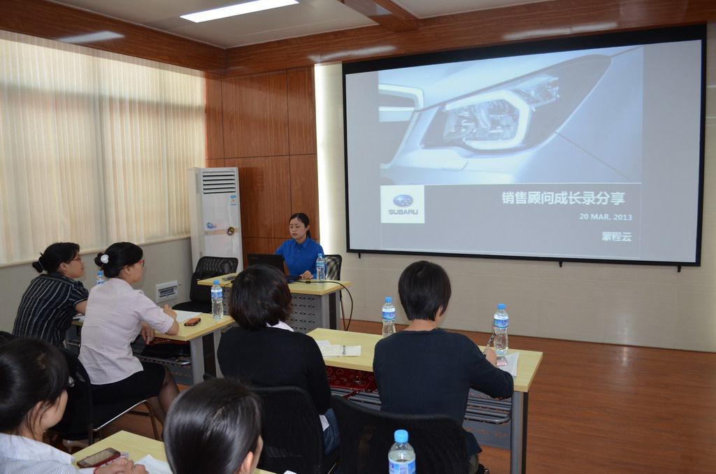 图片1:宽敞明亮培训室里师生分享汽车销售员职业成长典型案例