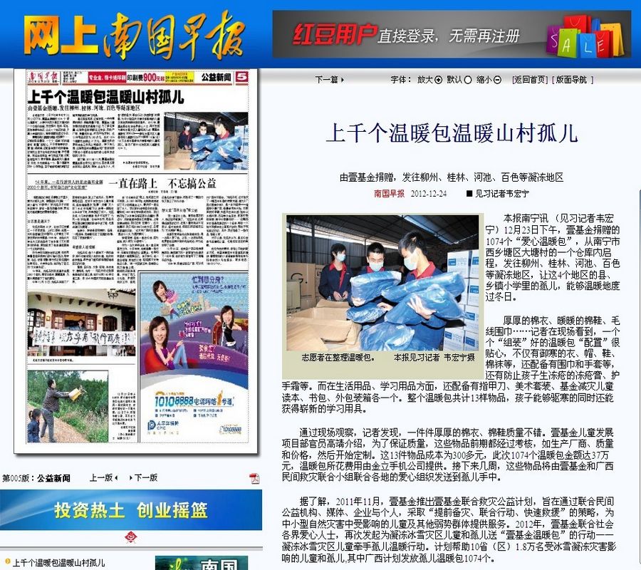 2012.12.24南国早报刊登了我院志愿者参加温暖山村孤儿的送温暖包活动