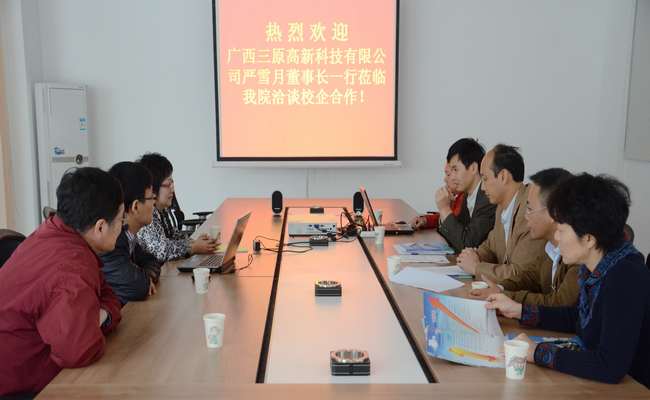 11月23日上午,广西三原高新科技有限公司董事长严雪月一行到我院洽谈合作事宜,受到我院韦红教院长、关菲明副院长等有关领导的热情接待。