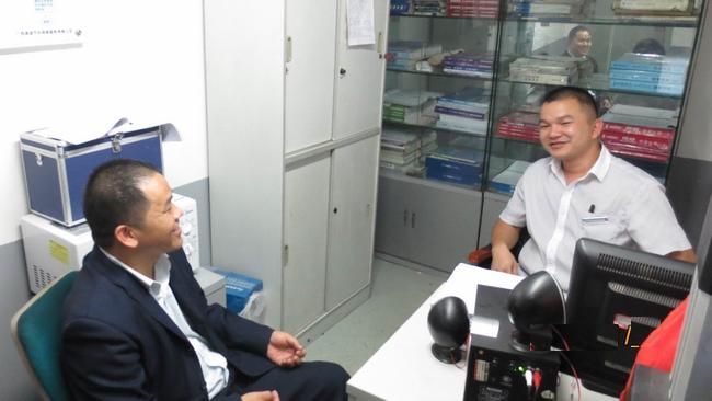 图5 梁振华副主任向北京现代桂林顺景特约销售服务店技术总监全石健了解毕业生工作情况