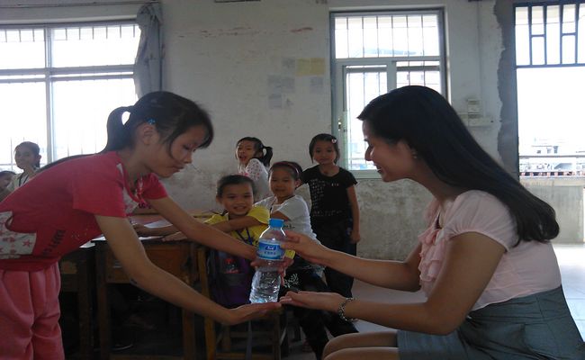 图五:小朋友在学习正确的递水姿势