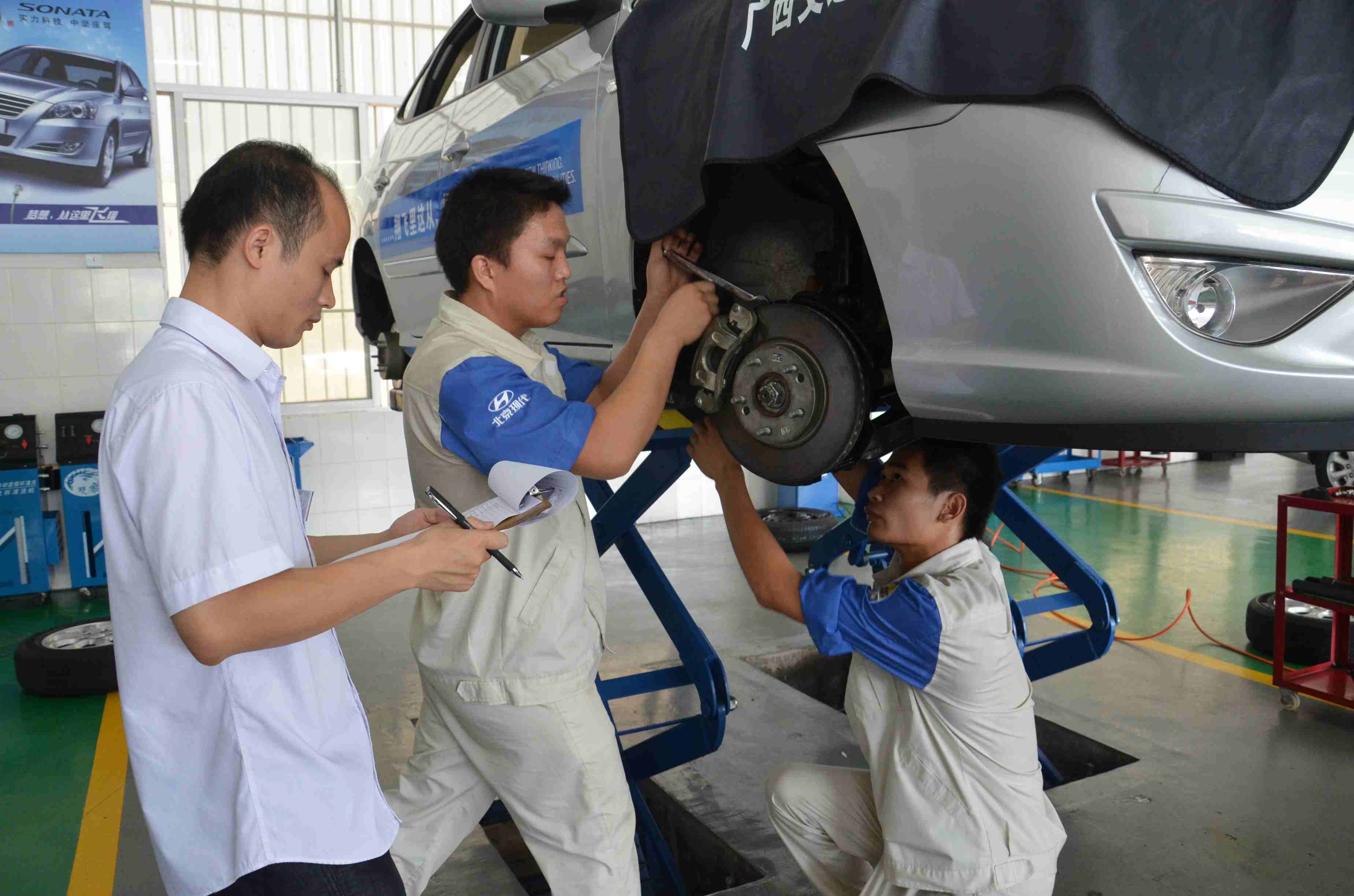 据悉,此次理论考试为期1小时,在学校2号教学楼102教室进行。操作考试为期近6小时,在学校实训楼1楼北京现代班实训场地。考核内容包括15000公里汽车维护必考项及节气门清洗、灯光故障排除、节温器检修、正时皮带拆装等7选1项目。考场上同学们一丝不苟,熟练地按考核内容逐项完成任务,只见汽车维护项目中,2人一组的两位学生默契配合,分工明确,有序进行相关操作考试;单项考试的考生按操作项目的考核步骤逐项完成。本着公平、公正、严肃的原则,本次考试考试监考工作由北京现代总机厂培训科、北京现代班核心教师、玉柴集团广西通源北京现代4S店技术负责人三方共同完成,其中,广州市交通技师学校和我校分别派出一名北京现代班核心教师到对方学校进行监考。此次考试,考出了我校学生的水平,也向企业展示了我校的教学成果。