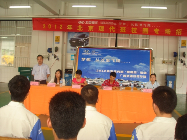 2012年6月6日,北京现代桂林顺景特约销售服务店、广西通源汽车销售服务有限公司、广西鑫广达汽车贸易有限公司、北京现代玉林得利特约销售服务店和梧州金欣汽车有限公司等5家北京现代汽车品牌的公司在我校召开专场招聘会,面试招聘我校2013届毕业顶岗实习生。