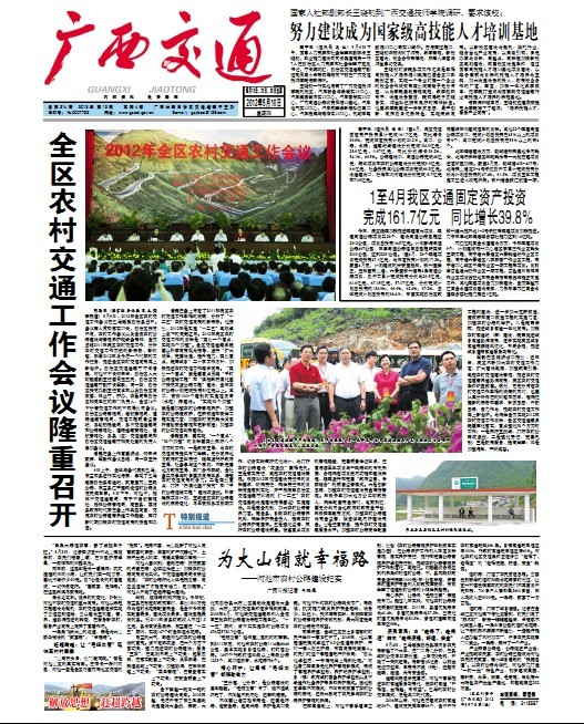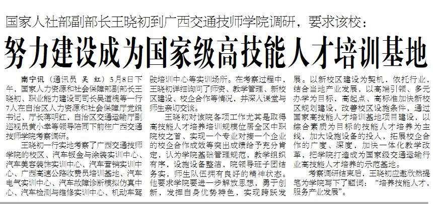 2012.5.10《广西交通》头版报道国家人社部副部长王晓初到广西交通技工学校调研消息