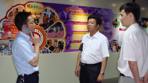 图七:韦红教校长和钟修仁副校长在广州市交通技师学校交流学习