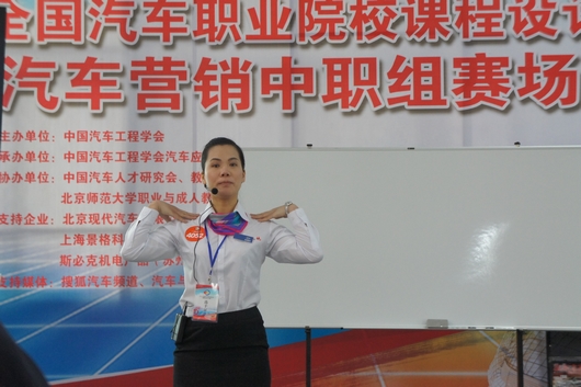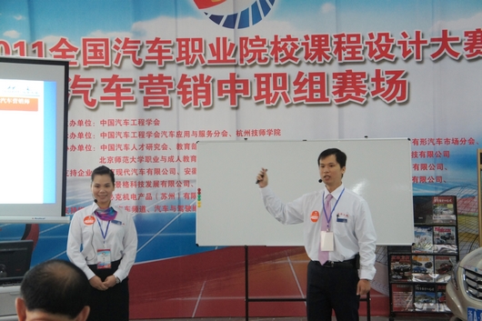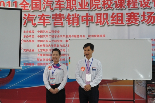 114的复赛环节中,我校代表队凭借对行为导向教学法的深刻理解,紧扣企业文化、工学结合的主题,以演讲的说课方式阐述了我校汽车营销课程的教学理念及课程组织方式,博得了专家评委及各院校观摩团的阵阵掌声。经过激烈角逐,我校参赛队从64支队伍中脱颖而出,以四强的身份跻身次日的决赛环节。梁丽丽、覃毅两位教师凭借稳定的心理素质、过硬的专业技术水平,在课程中始终贯彻5S现场管理,结合企业文化 ,突出体现了任务驱动的教学模式,得到了专家评委的一致好评,一位企业评委这样评价:这是一堂生动的企业培训课。我校代表队最终获得本次大赛一等奖的好成绩。