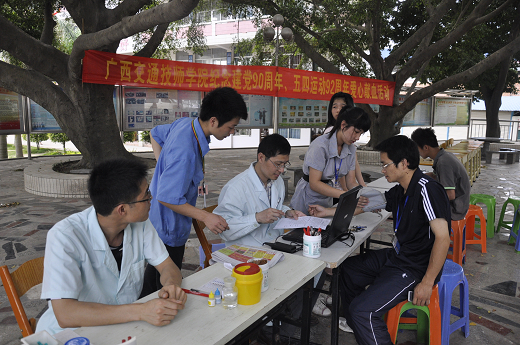 5月11日下午,我校举行了纪念建党90周年、五四运动92周年“爱心献血”活动,广大师生员工积极参与,纷纷献出自己的爱心。李爱东、谢琳娜等8名教职员工和曾俊侨等102名学生参加了活动。本次活动邀请南宁市血站到校园进行现场采血,是我校第六次组织师生开展爱心献血活动。
