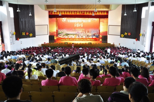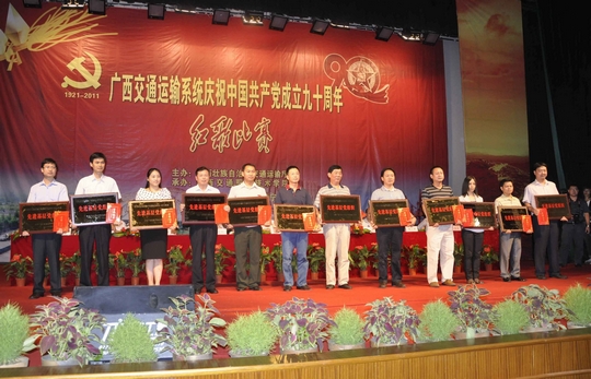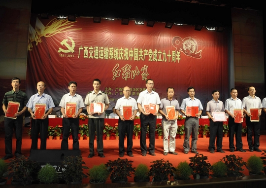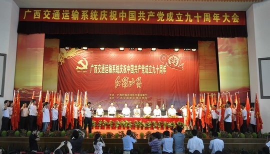 为隆重纪念党的生日,2011年6月28日上午,自治区交通运输系统庆祝中国共产党成立90周年大会在广西交通职业技术学院礼堂隆重召开。自治区交通运输厅党组书记黄华宽,副厅长李小林,副厅长梁毅,纪检组组长朱名胜,副巡视员黄小幸,自治区直属机关工委常务副书记韦彩英等领导出席大会并为受表彰的先进集体和先进个人颁奖。厅直属各单位、各地市交通运输部门的领导、先进代表、职工代表参加了庆祝大会。