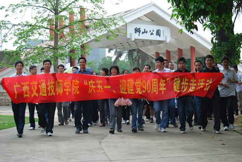 为迎接五一国际劳动节,庆祝建党九十周年,激发职工的健身锻炼热情,2011429日下午,广西交通高级技工学校工会组织全院教职员工在南宁市狮山公园开展了庆五一、迎建党九十周年健步走活动。
