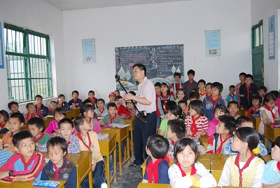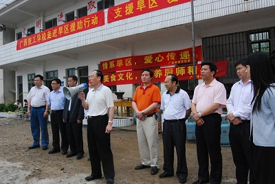 5月8日上午,自治区人力资源和社会劳动保障厅于祖毅副厅长带领广西交通高级技工学校、广西石化高级技工学校、广西柳州高级机械技工学校、广西新闻出技工学校、华南职业技术学校的代表,进入了地处边远山区的河池市环江县洛阳镇玉合村大吉矿产希望小学,举行爱心助学捐赠仪式。