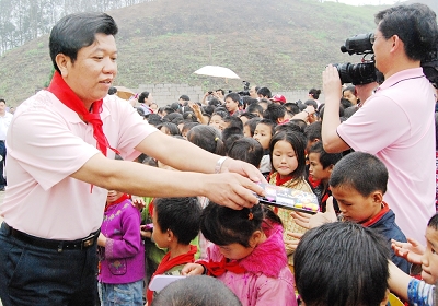 图三:我校钟修仁副校长把文具、书本发送到学生手上