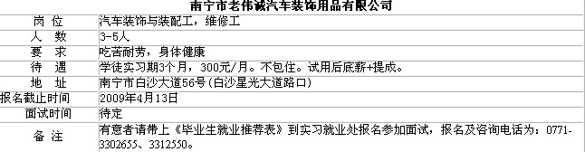 “南宁市老伟诚汽车装饰用品有限公司”诚聘汽车装饰与装配工和维修工