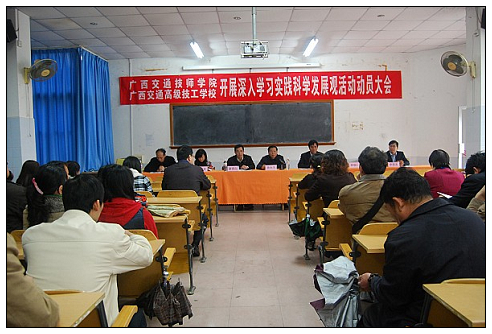 2009年4月2日,广西交通高级技工学校隆重召开了深入学习实践科学发展观活动动员大会。自治区道路运输管理局党委副书记蒙青山、政治处副主任王爱君同志出席了会议,学校全体教师党员、中层以上领导干部以及部份职工参加了会议。动员大会由学校党委副书记陆天云同志主持,学校党委书记、校长孙永生同志在会上作了动员报告,对学校开展深入学习实践科学发展观活动提出了具体要求和全面部署。孙书记指出开展深入学习实践科学发展观活动,是学习贯彻党的十七大精神的重大举措,是解决影响教育科学发展突出问题的良好机遇,是提高广大党员干部和教师政治素养的内在要求。每一位党员教师都要深刻理解和把握科学发展观的科学内涵和精神实质,自觉解放思想、更新观念、按照方法步骤,明确目标,通过学习实践活动提高自身素质,增强落实科学发展观的能力,推动学校在教育改革发展、提高教育教学质量、加强党的建设以及创建品牌职业学校上有新突破、大发展。自治区道路运输管理局党委副书记蒙青山在会上作了重要讲话,要求全体党员干部一定要按照上级党委要求统一思想,统一认识,要站在全局和战略的高度充分认识学习实践活动的重要意义,准确把握学习实践活动的指导思想、基本原则和目标要求,切实增强学习实践科学发展观的自觉性和坚定性,创新办学理念,创新办学特色,认真履行职责,严格要求,切实提高教育教学水平。