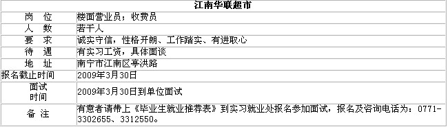 “江南华联超市”诚聘楼面营业员和收费员