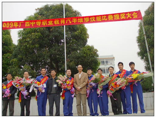 我校韦陈寿、李桂、陈忠海、黄高四位同学在梁国伟老师的精心指导下,经过长期刻苦训练,在 2009年全区中等职业教育汽车维修技能比赛中不畏强手,发挥出色,韦陈寿、李桂团队勇夺团体赛一等奖;陈忠海、黄高勇夺团体赛二等奖,我校参赛选手获奖率达100%,充分展示了我校教学成果和良好的职业素质。