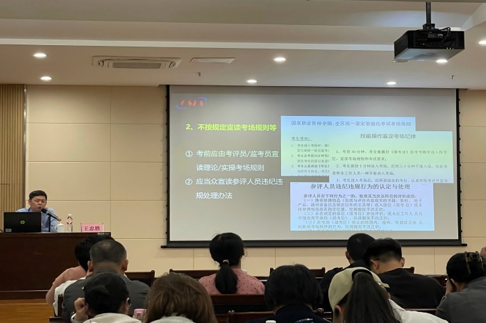 王忠胜部长围绕技能人才评价申报条件新规程、考评人员常见问题类型、如何提升考评技术、违纪违规处理办法等多个关键主题展开详细解读与分享。通过理论知识讲授、案例分析与现场互动交流等多种形式,帮助考评员们深入浅出地理解技能人才评价工作的新政策、新技术、新要求,为全体考评员全面、精准掌握考评工作的要点与关键环节,有效提升了实际业务操作工作能力提供遵循和经验参考。