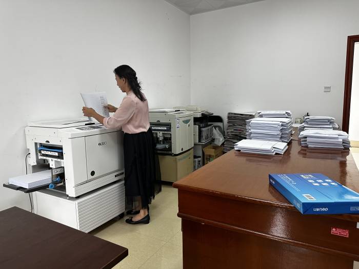 期末期间,面对全校各院系密集的考试需求,办公室成员主动放弃休息时间,开启“接力式”工作模式,累计完成试卷复印千份。为确保试题保密性,团队严格执行“专人对接、双人核验”制度,从排版、印制到分装全程无缝监管。针对部分院系紧急增补的试卷需求,工作人员连续加班,确保所有试卷在考前交付,以“零延误”保障了考试公平。